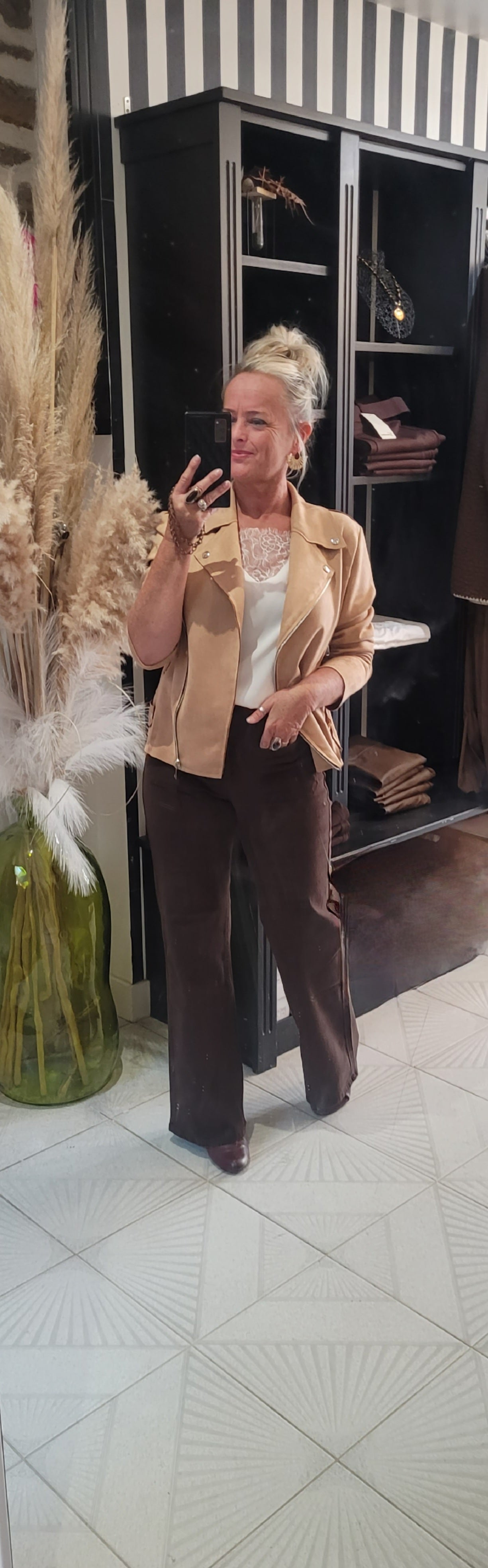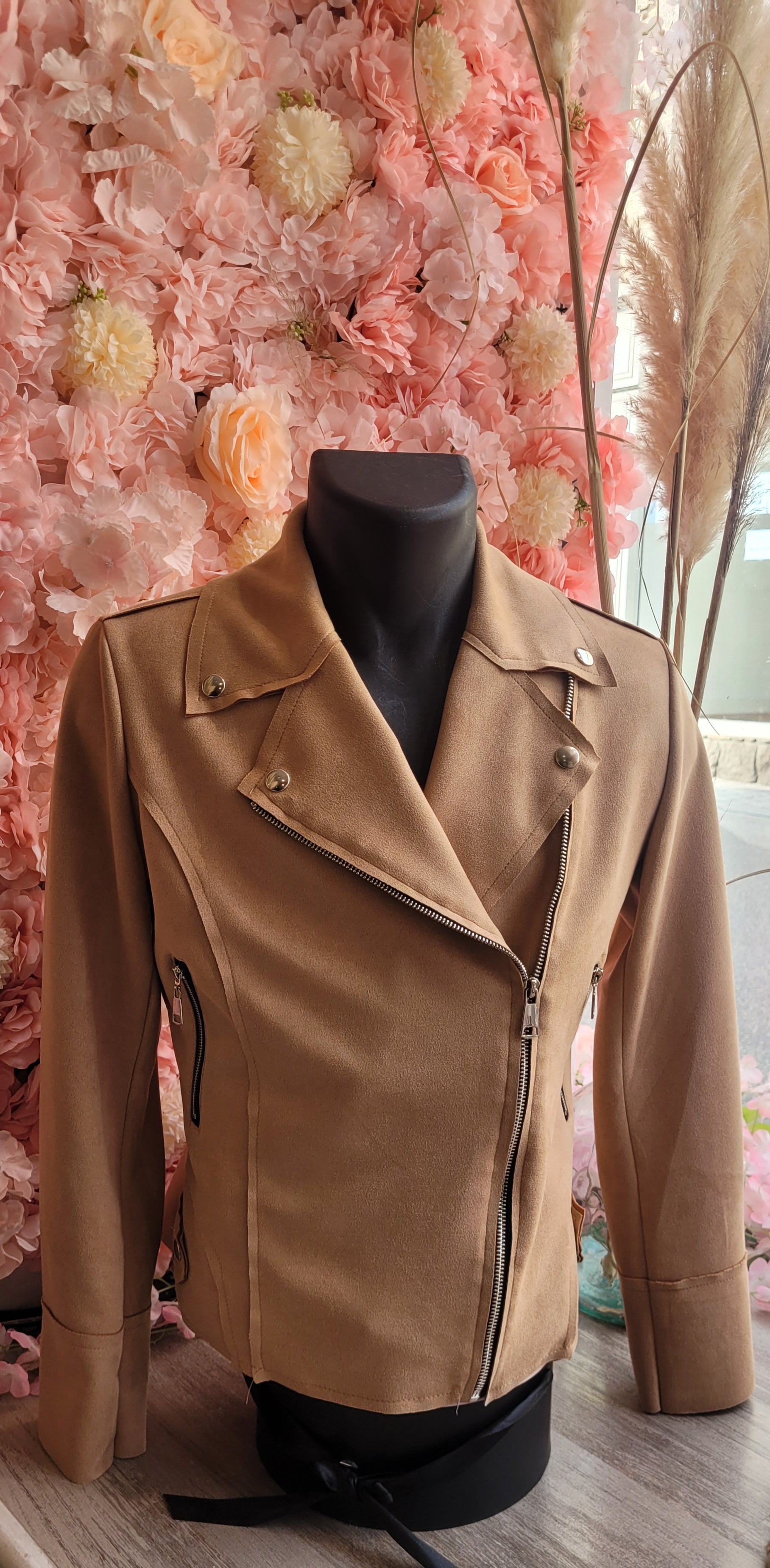 Perfecto élégant en suédine beige,alliant l'effet rock et douceur du toucher .Cette veste vous apporte du caractère à toutes vos tenues.